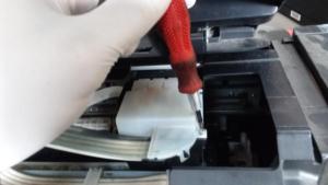 Pues bien, decidí realizar un circuito para remover los atascos de la tinta seca del cabezal, luego de fabricarlo, vertí alcohol etílico puro al 70% y agua destilada en proporciones de 50/50. No vi que el circuito funcionara exitosamente, así que tuve que hacerlo de form manual, limpiar cada cabezal por medio de presión proporcionada por una jeringa.